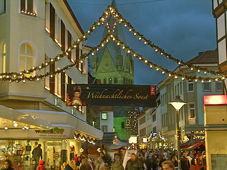 Eine ritterliche Figur weihnachtlich beleuchtet am Rathaus Soest