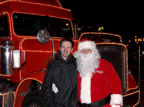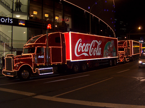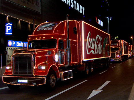 Die fünf beleuchteten Coca-Cola Weihnachtstrucks fahren langsam ...