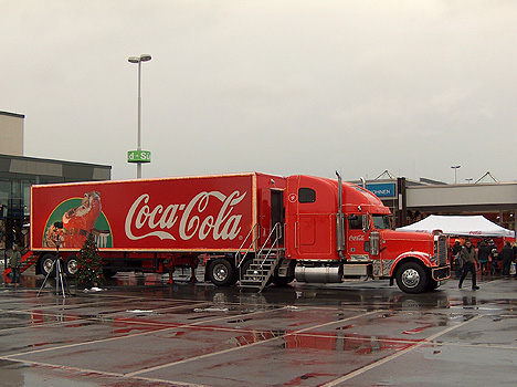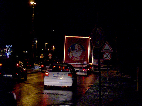 Der beleuchtete Coca-Cola Weihnachtstruck fährt los ...